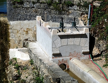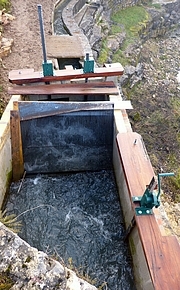 CHAMBRE D'EAU et VANNAGE 3 vannes de manoeuvre une pour le débit réservé une pour la roue une pour la turbine | ![]() |