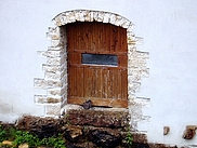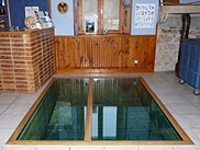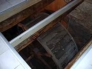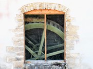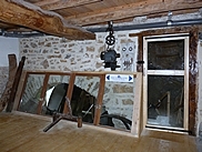 | L'ancienne porte côté rivière derrière laquelle se cachait la roue a été remplacée par une vitre. |